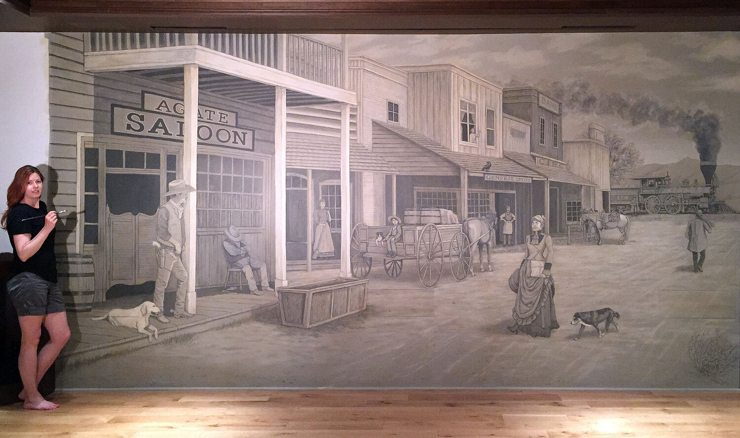 An old western town scene custom designed to include specific elements and characters related to the clients.