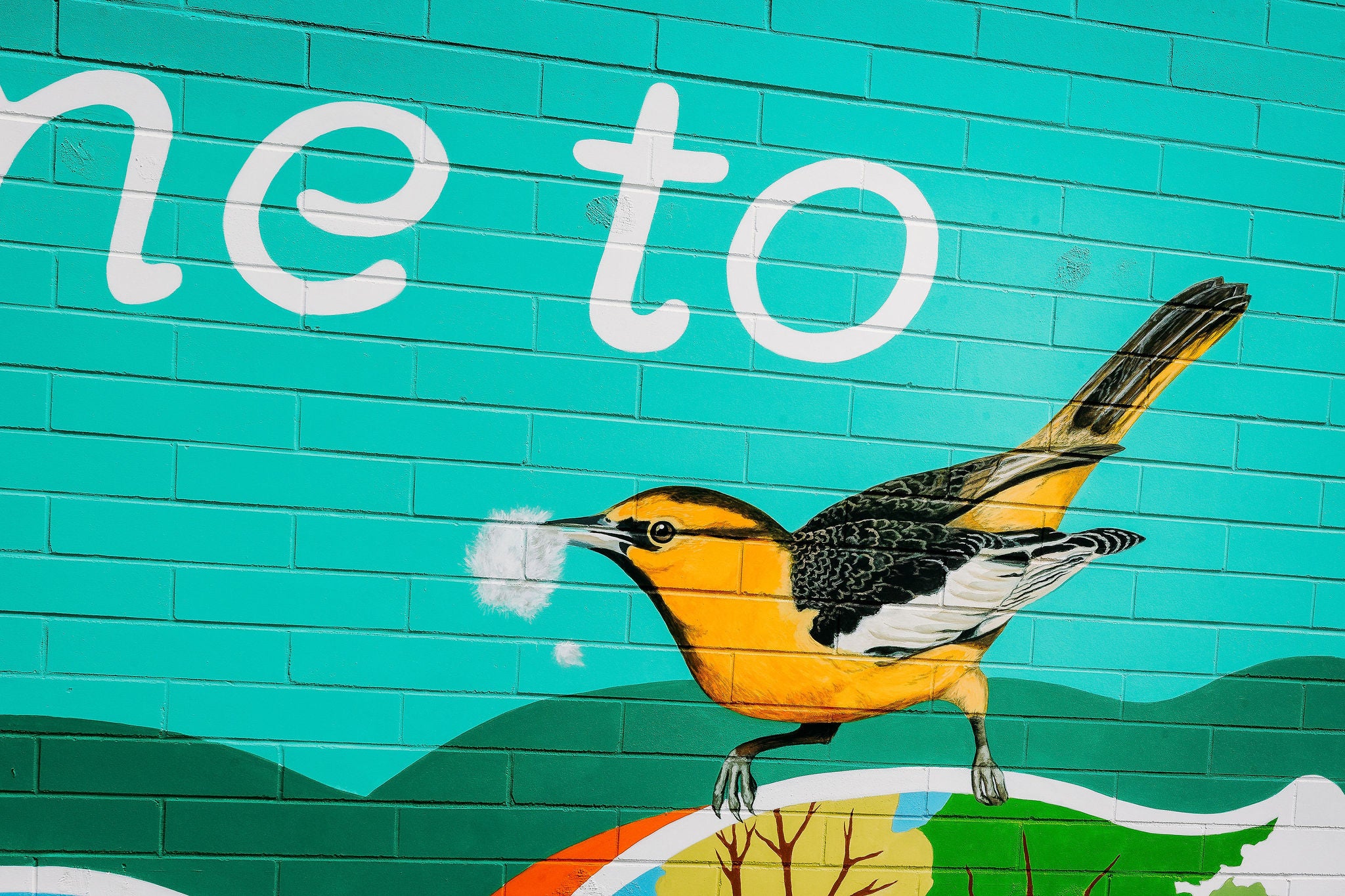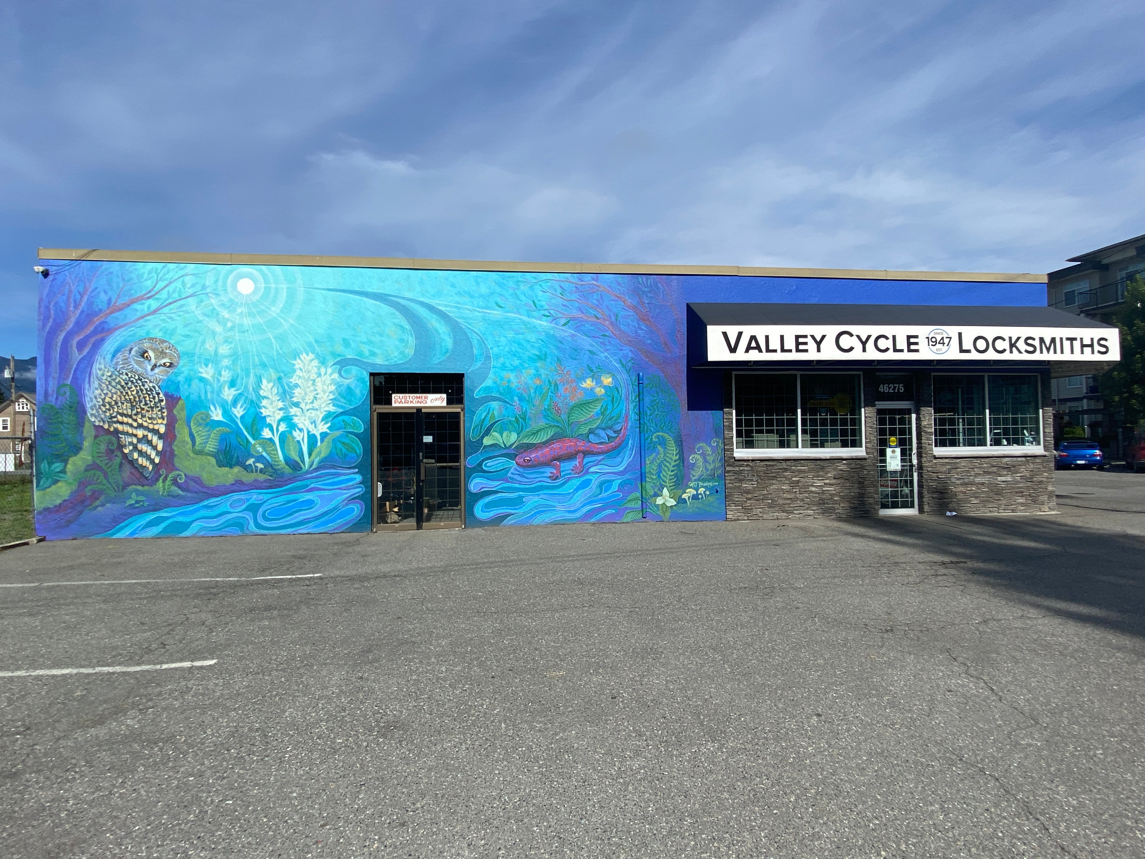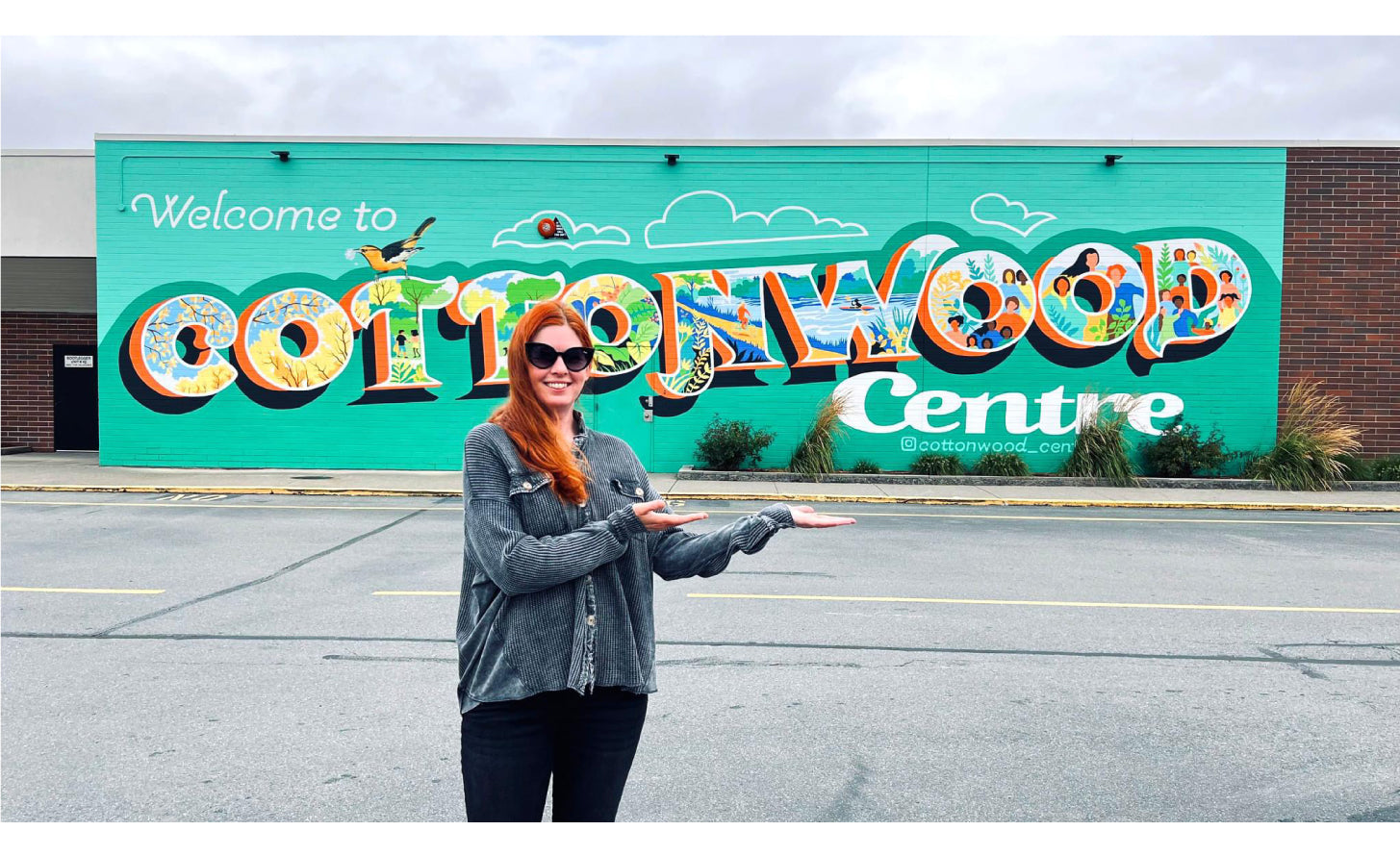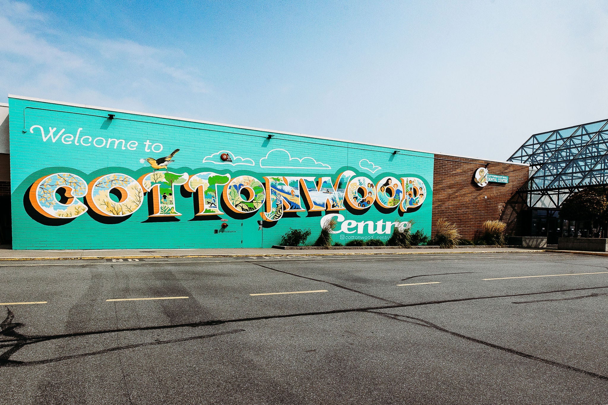 2024 "Welcome to Cottonwood Centre" 18'x64' exterior mural on brick. Commissioned by the Cottonwood Centre in Chilliwack B.C.