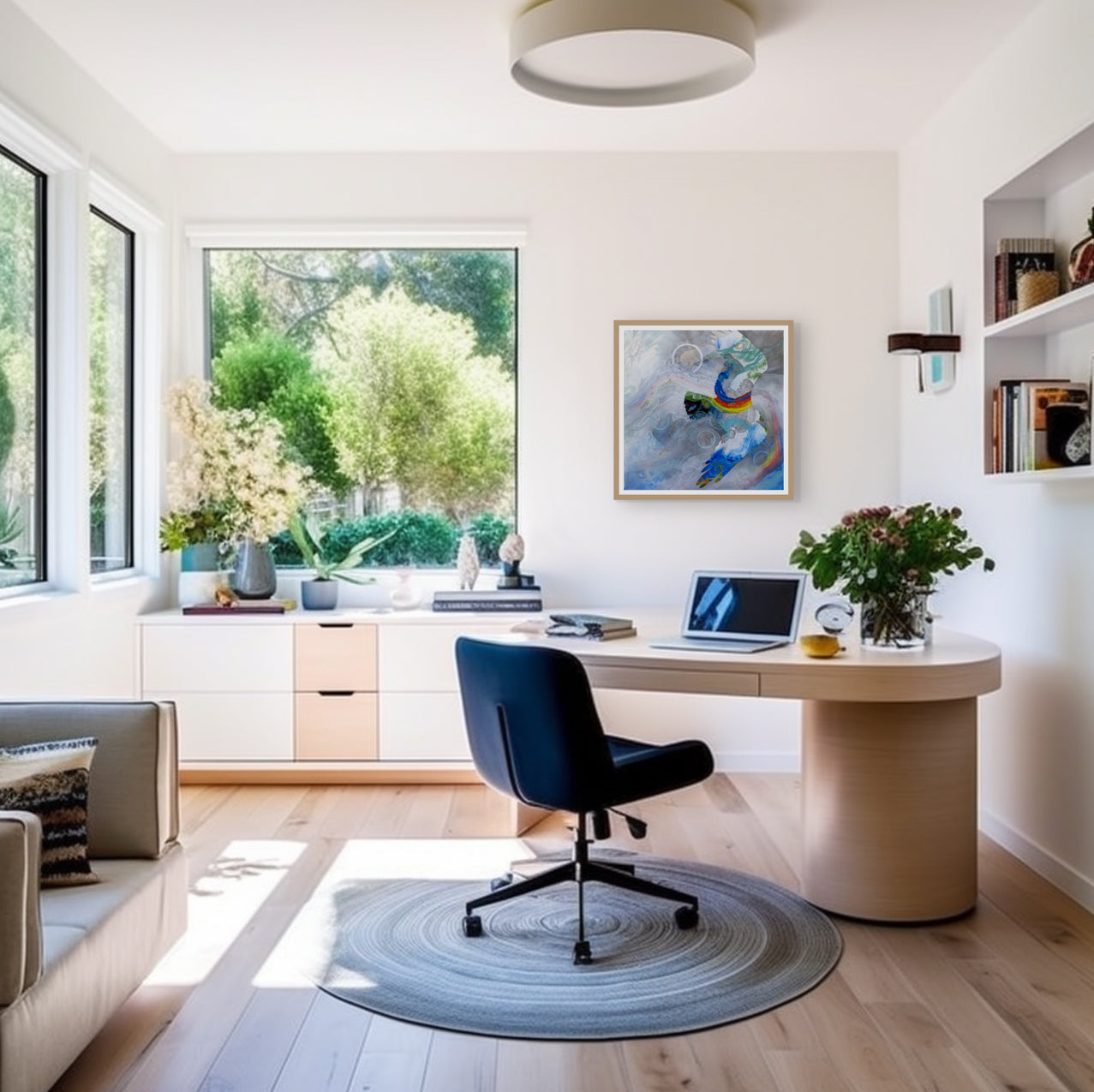 Canvas prints are available in 24"x24" and 36"x36". The size represents the front face of the canvas. Extra material is printed with the artwork around all sides to accommodate stretching the canvas on to 1.5" thick stretcher bars. Carly's signature is placed discreetly on the bottom side of the wrapped canvas.