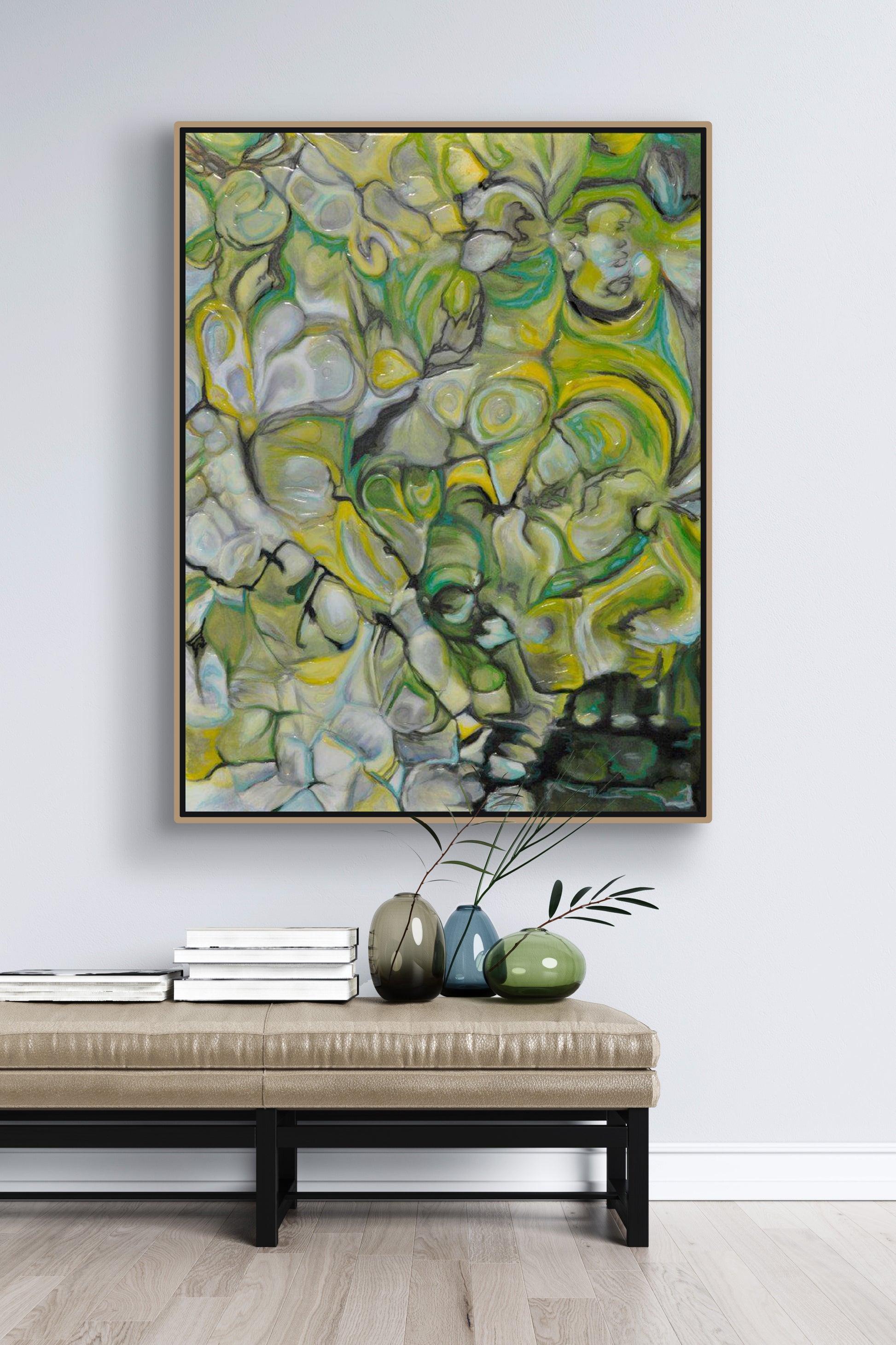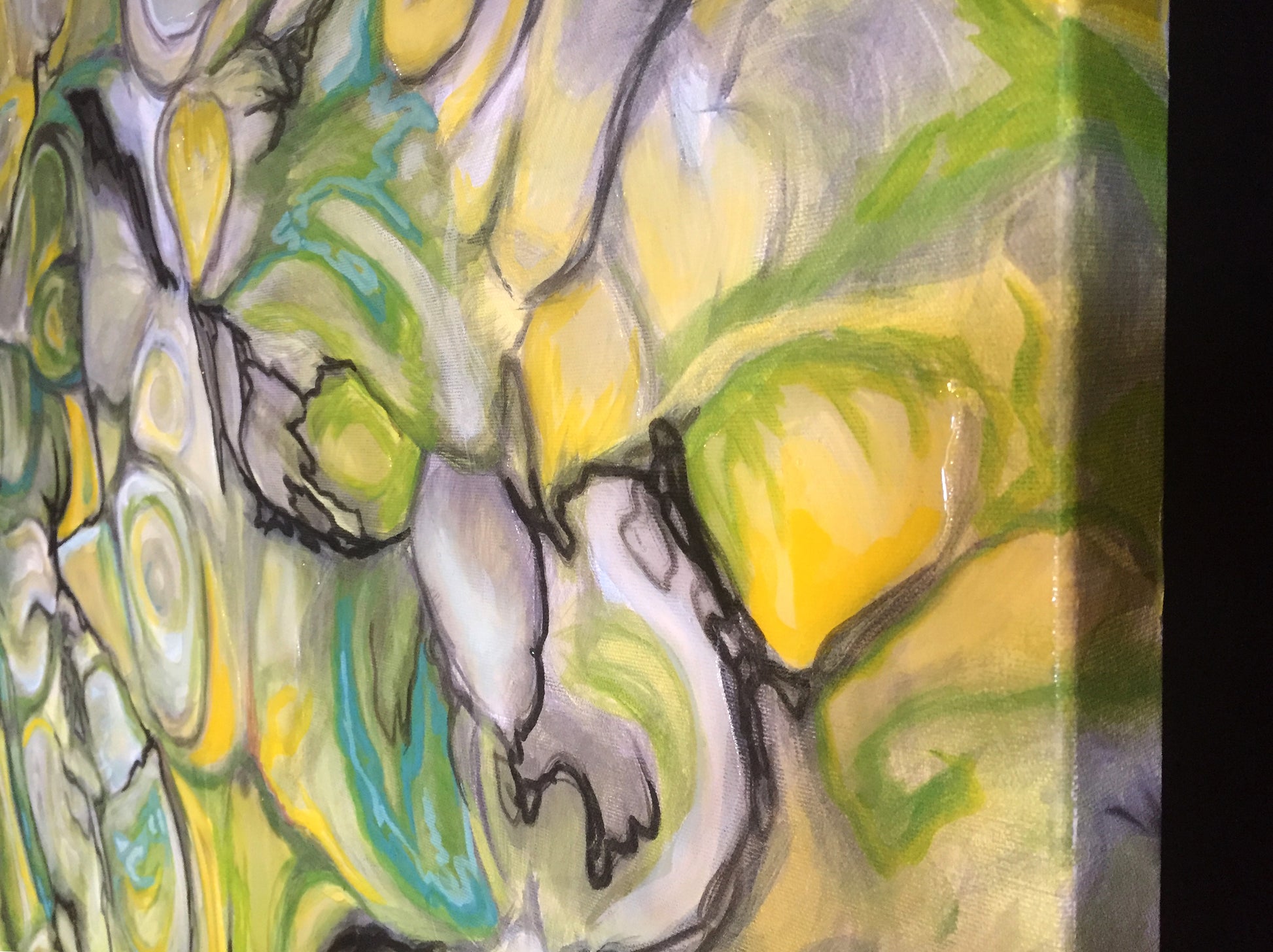 This painting wraps around the sides of a deep canvas that is back-wrapped for a clean presentation for display option without framing. It's a Canadian-made canvas, 100% pure cotton stretched on 1½″ deep basswood stretcher bars.