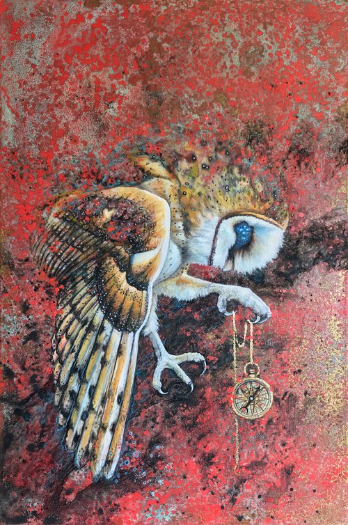 This painting was a creation of pure intuitive exploration. I began by covering the canvas in gold metal leaf and applying liquids and salt in natural patterns which created the bright red and aqua oxidization. Then adding in black paint to break up the pattern.... and then it sat for years until one day when I was learning to use oil paints I was drawn back to the canvas and started painting in the owl who called out through my intuition. There's a very deep message in the images I added to the owl, the compass and it's reading and the Seven Sisters star system within the eye. Seven is my number, but I didn't know I had chosen these symbols of seven until after they were added in... what does it all mean exactly? I'm yet to discover the totality of the magic hidden within this piece!