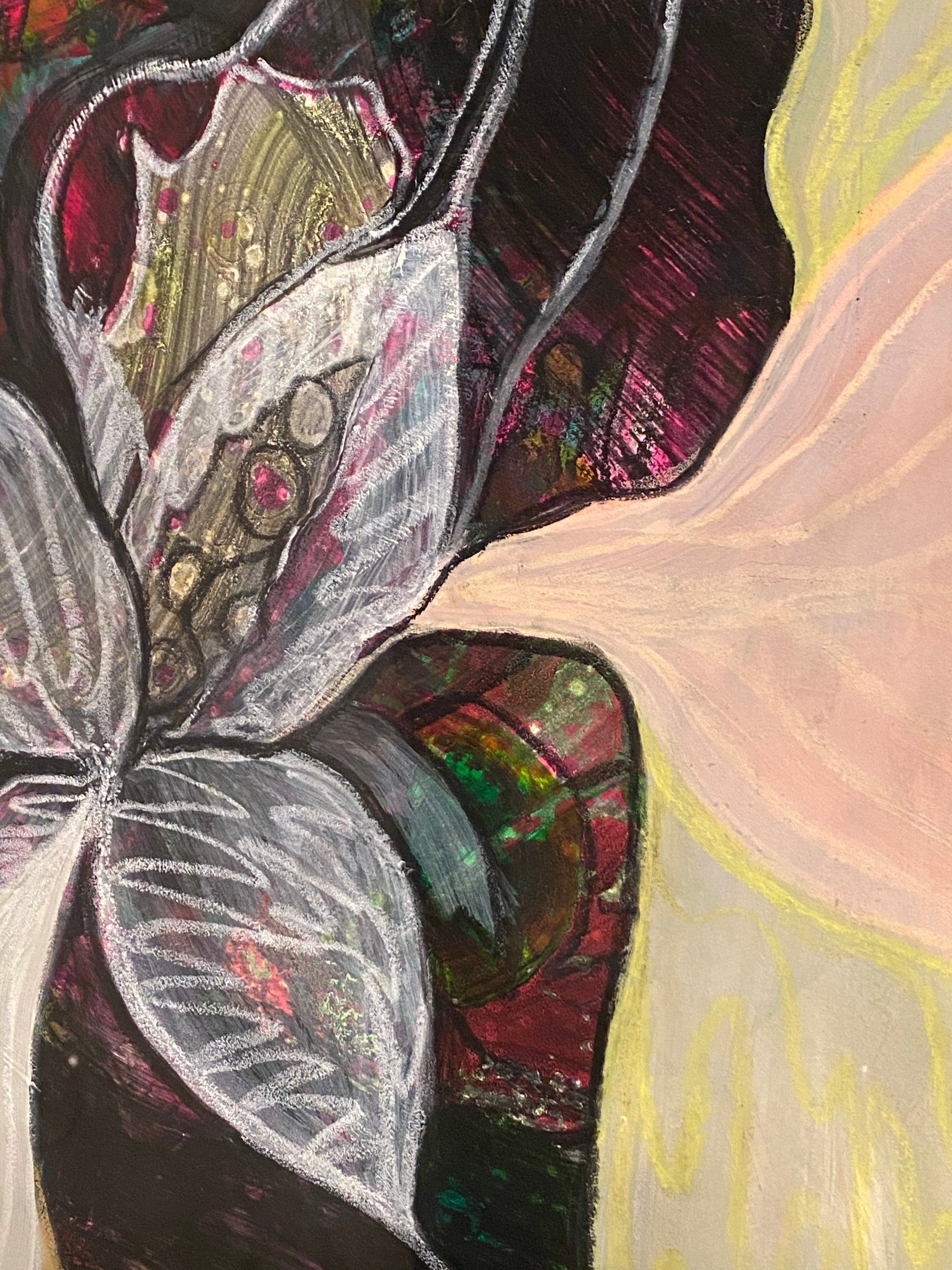 Acrylic and oil pastel on paper sealed with a matte varnish.